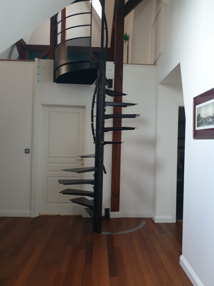 Dans le cadre de ce projet, nous avons conçu un escalier hélicoïdal rétractable en acier thermolaqué noir de 12 marches ainsi qu’une marche palière arrondie et son garde-corps en tôle perforée et en barreaudage horizontal. Le mur étant en placo ba13, nous l’avons renforcé en venant y fixer une plaque en acier thermolaqué blanche sur laquelle repose la structure palière, assurant ainsi sa solidité.