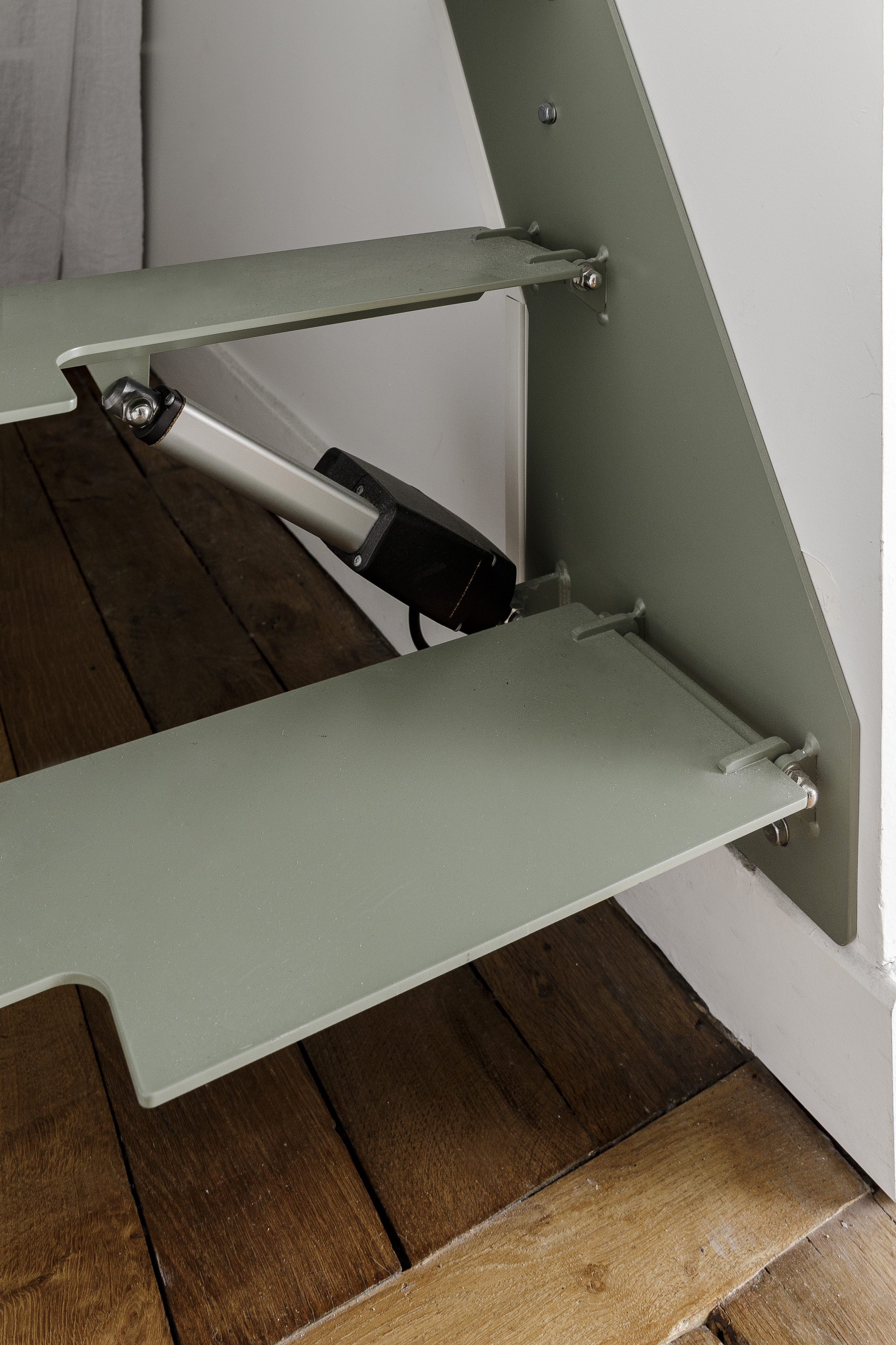 L’escalier droit automatisé se replie intégralement contre le mur pour ne faire que 10 centimètres d’épaisseur en position fermée.