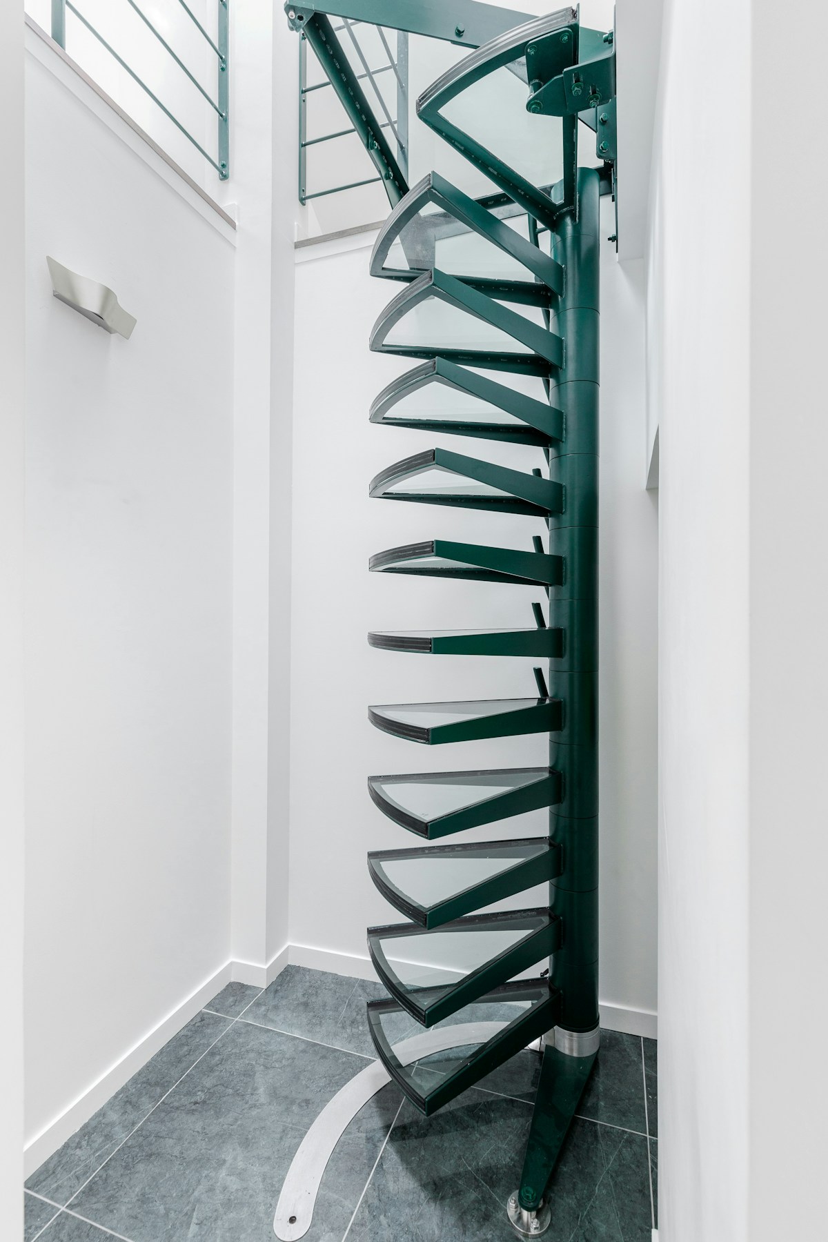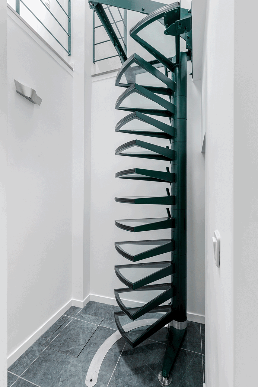 Dans cet appartement du Marais entièrement rénové pour intégrer les combles, nous avons créé un escalier hélicoïdal rétractable. Unique accès à l'étage, cet escalier se replie intégralement pour libérer la trémie et permettre de monter et descendre des meubles. Conçu avec des marches en verre, cet escalier laisse passer la lumière.