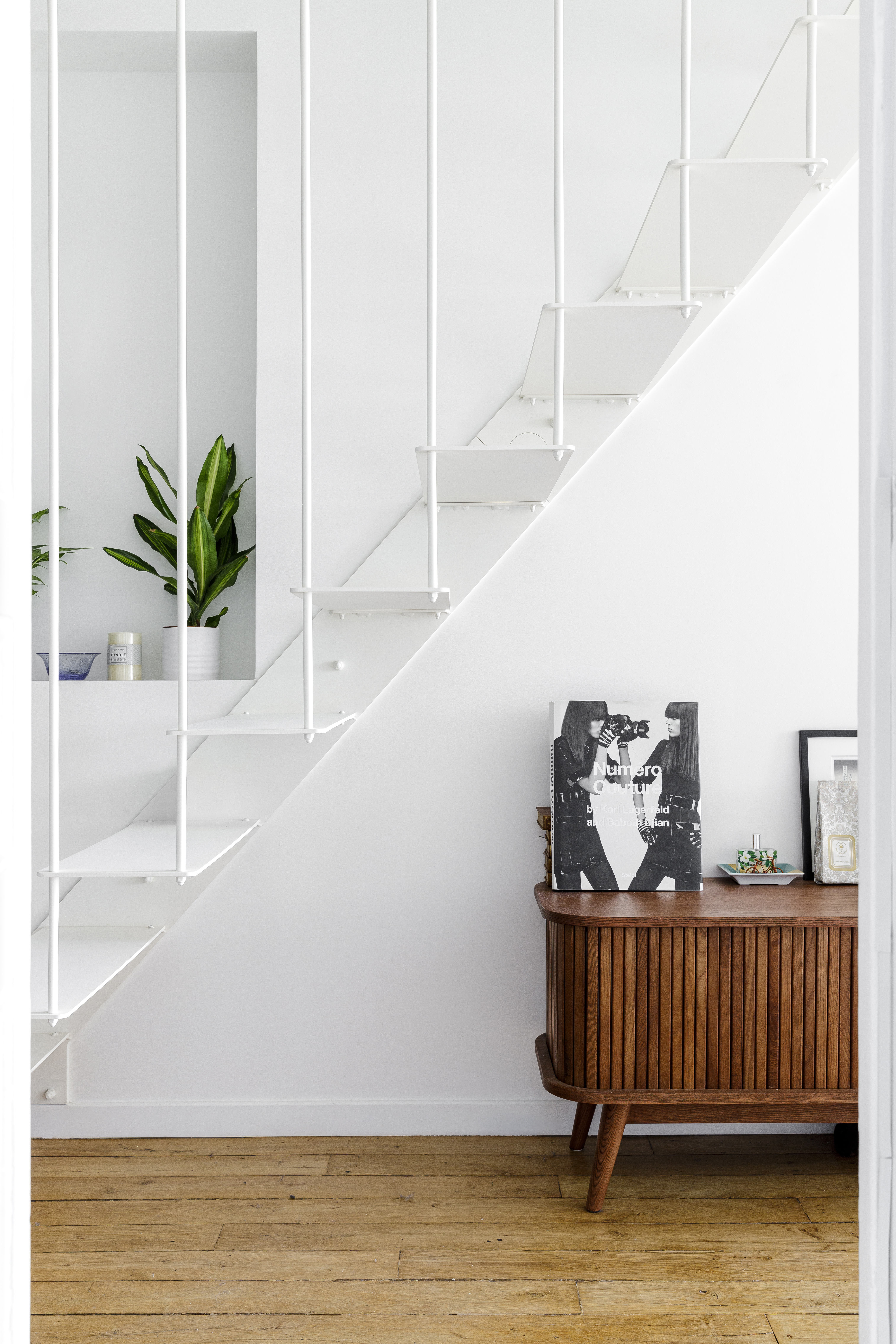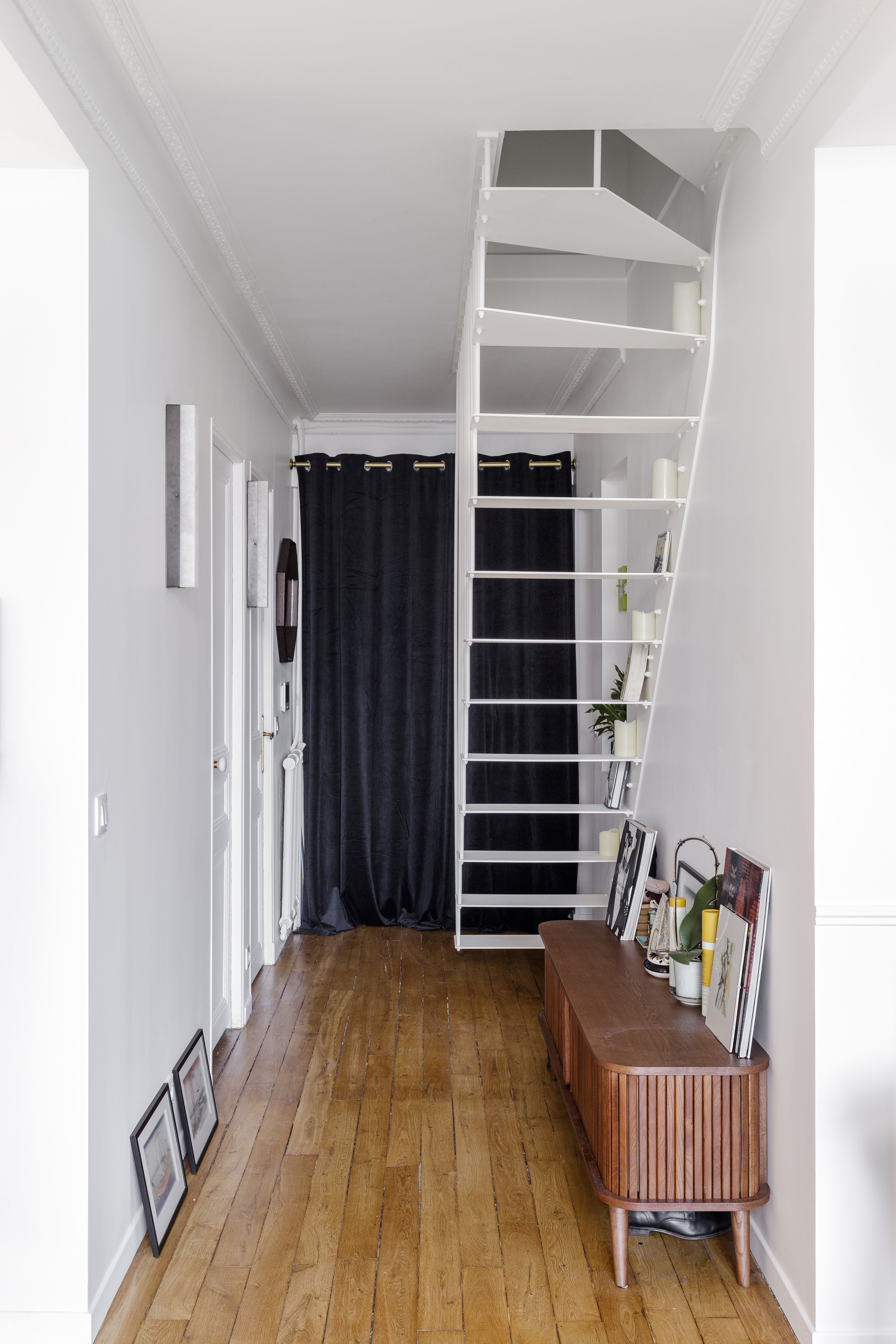 Nous avons réalisé un escalier à pas déportés pour ce duplex parisien aux Batignolles. L'escalier, installé dans l'entrée, permet un gain de place tout en gardant un côté épuré laissant ainsi passer la lumière. Sa ligne esthétique s'intègre parfaitement sur le mur faisant de cet escalier un élément design dans l'appartement.