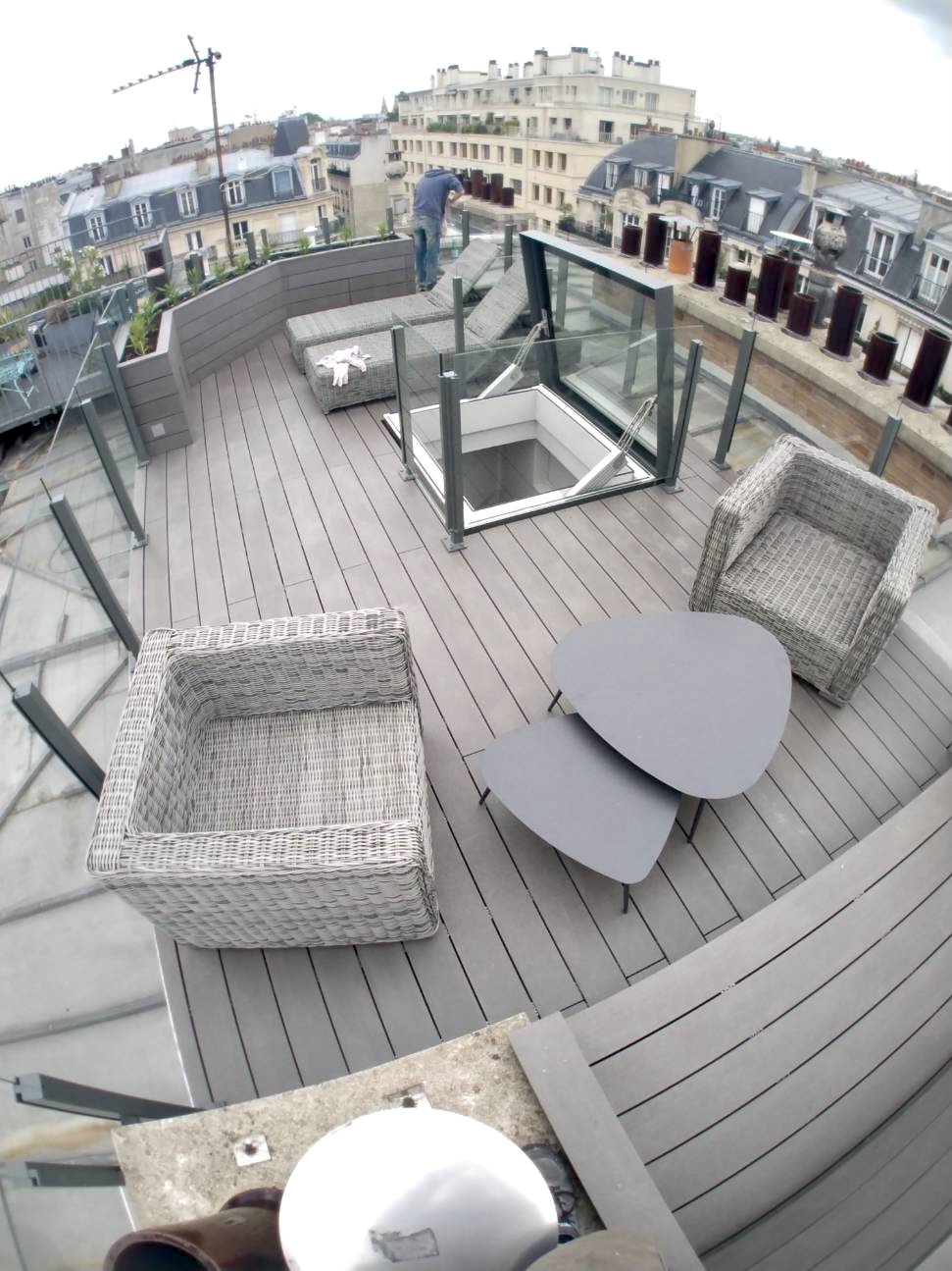 Projet : Création et aménagement d’une terrasse sur le toit d’un immeuble parisien avec l’installation d’une fenêtre de toit, d’un escalier hélicoïdal rétractable et l’aménagement de l’entrée de l’appartement.